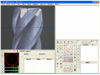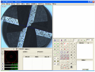 刀具測量軟件除了具備測量軟件的常用功能外,增加視頻區(qū)的十字線對位功能,通過鍵盤方向鍵調(diào)節(jié)十字線可以快速的測量出刀口的角度??梢酝ㄟ^鍵盤數(shù)字鍵1、2快速切換CCD鏡頭,從而能從不同角度和方向觀測被測物體。在測量工作區(qū)域中,增加了六個快速檢測距離的功能.