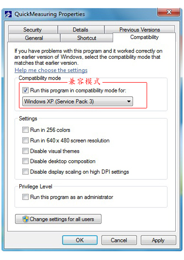 電腦桌面QuickMeasuring測量軟件快捷方式圖標(biāo)右鍵->屬性(打開QuickMeasuring屬性)->選擇“兼容性”標(biāo)簽,勾選“以兼容模式運(yùn)行這個(gè)程序”,然后在下拉菜單里選擇一個(gè)兼容模式,完成后確定退出。